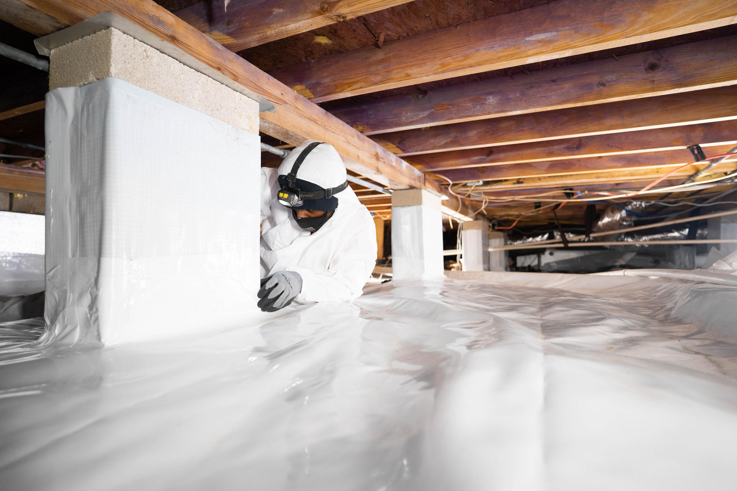 After installing the vapor barrier, you’ll want to insulate the crawl space. Insulation helps regulate the air quality of your crawl space by keeping hot or cool outside air away and limiting the potential for mold growth