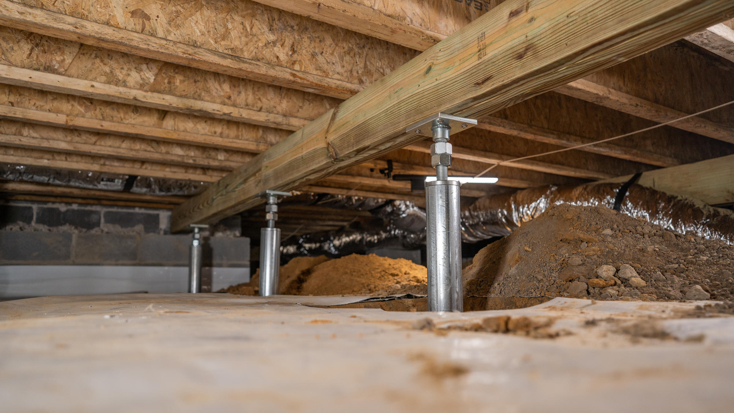 Crawl space support posts, also known as adjustable steel piers, are used to stabilize and level floors above crawl spaces. These posts can be adjusted to provide the necessary support and prevent sagging or uneven floors caused by foundation issues.