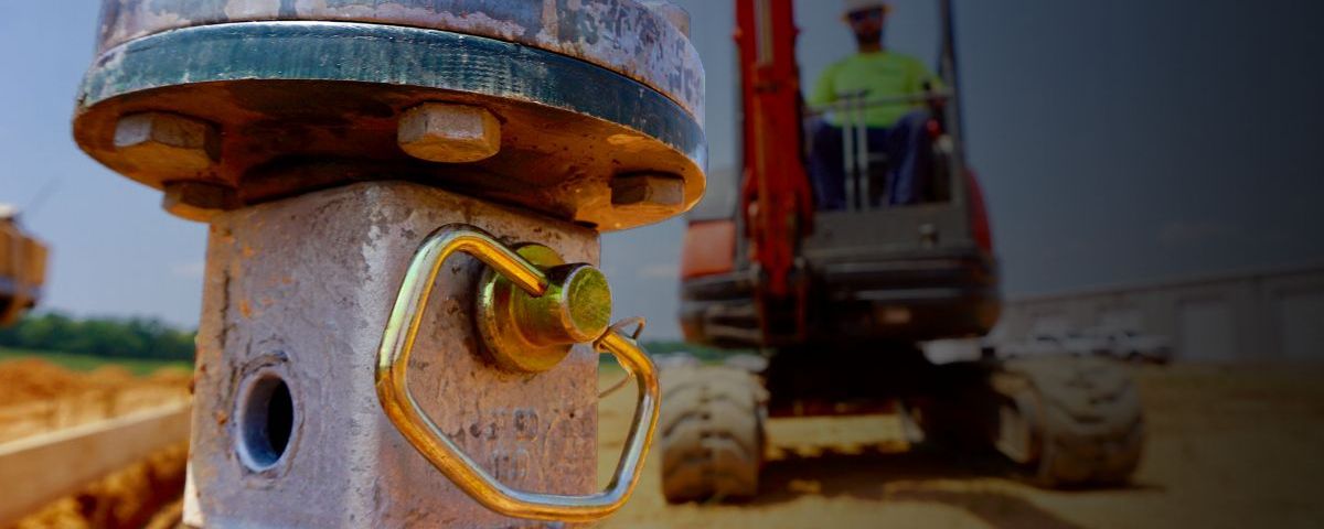 Close-up of construction equipment part with a worker on machinery blurred in the background at a worksite.