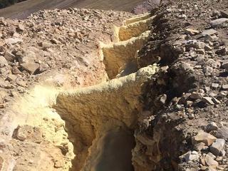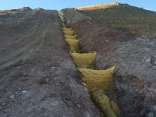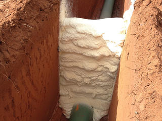 The 2-part foam used in geotechnical applications has unique characteristics that provide significant advantages in trench breaker construction. When the SPF resin and catalyst compounds are mixed at the application nozzle, the chemical reaction turns the liquids into expanding foam with excellent adhesive qualities. The foam penetrates loose soil and bonds to the sides of the trench excavation.
